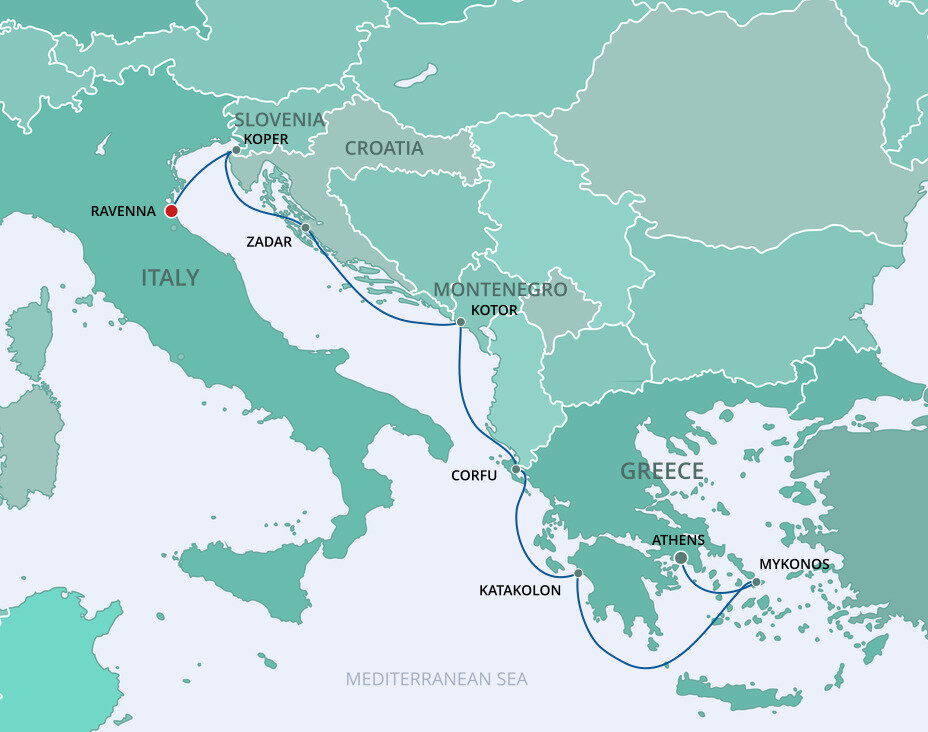 The lush and verdant island of Corfu lies in the Ionian Sea, midway between Greece and Italy. It is an island of sparkling beaches, mountains splashed with wildflowers, and historical, perched fortresses. Ships will dock at the town of Corfu.