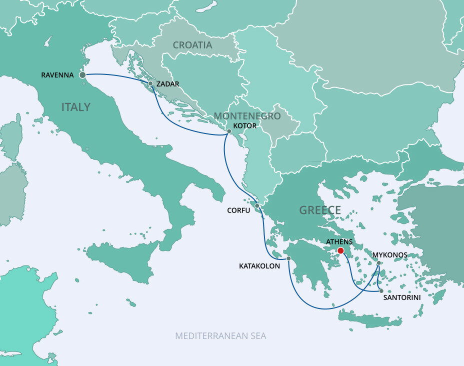 The lush and verdant island of Corfu lies in the Ionian Sea, midway between Greece and Italy. It is an island of sparkling beaches, mountains splashed with wildflowers, and historical, perched fortresses. Ships will dock at the town of Corfu.