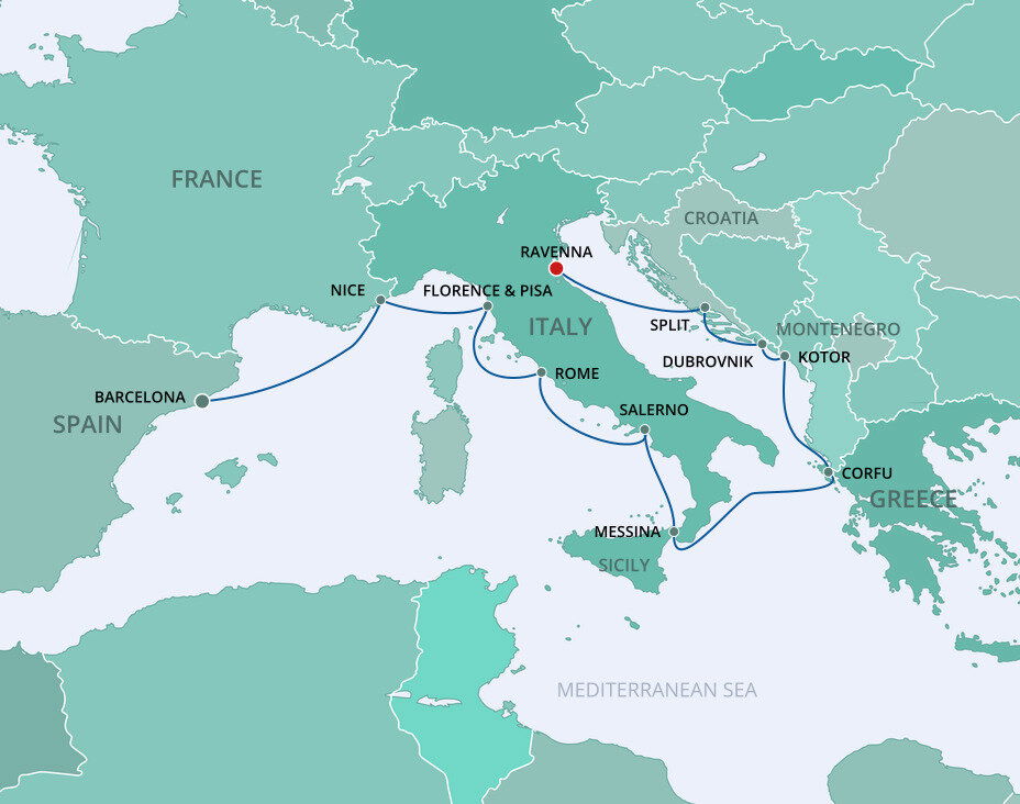 Ravenna, “The Mosaic City”, is best known for its churches which date back 1,500 years and are decorated with stunning Byzantine mosaics. If you're not staying in Ravenna at the end of your cruise, Bologna it's approximately 85 kms (53 miles) away, and Venice is approximately 140 kms (87 miles) away - a journey that takes about 2 hours by train.