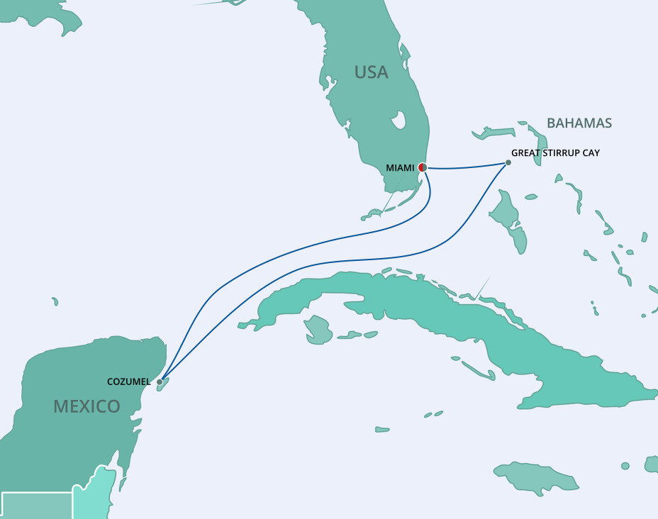 Nestled in the Bahama’s Berry Island chain is a 250-acre uninhabited paradise waiting for you. Great Stirrup Cay is a private retreat designed specifically for cruise guests enjoyment. Ships will anchor offshore and tenders will be provided to the shore.