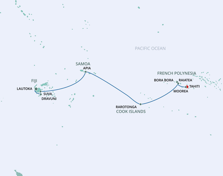 The island's unique geography makes Moorea one of French Polynesia's most breathtaking islands. Eight mountain peaks carpeted in lush vegetation rise from a translucent lagoon and two tranquil bays. Ships will anchor offshore and tenders will be provided to the shore.