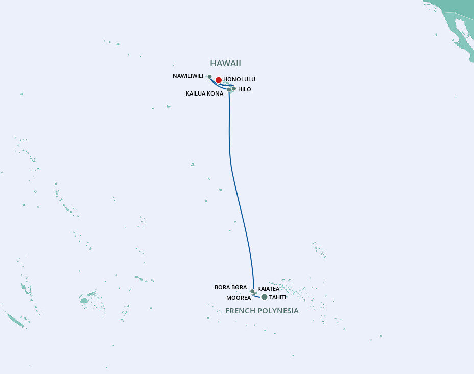 The island's unique geography makes Moorea one of French Polynesia's most breathtaking islands. Eight mountain peaks carpeted in lush vegetation rise from a translucent lagoon and two tranquil bays. Ships will anchor offshore and tenders will be provided to the shore.