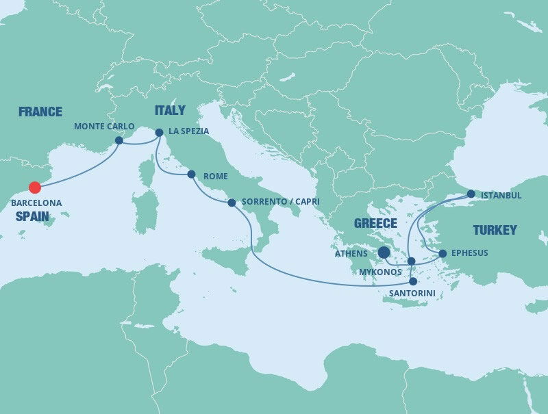 Your cruise finishes today in Barcelona, a captivating city on Spain's northeastern coast. If you're extending your stay in the city, start with a visit to La Sagrada Família, Antoni Gaudí's masterpiece, then wander through the narrow, historic streets of the Gothic Quarter.