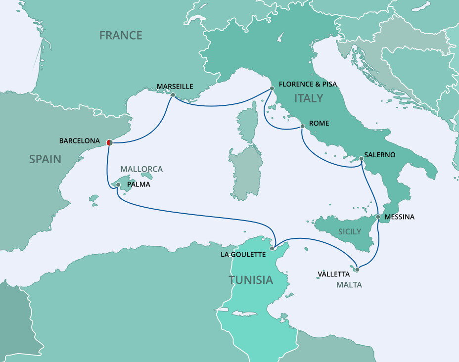 Your cruise finishes today in Barcelona, a captivating city on Spain's northeastern coast. If you're extending your stay in the city, start with a visit to La Sagrada Família, Antoni Gaudí's masterpiece, then wander through the narrow, historic streets of the Gothic Quarter.