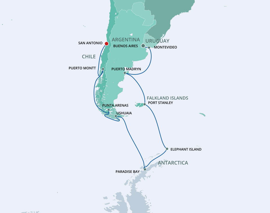 Located at the southernmost end of South America, Ushuaia is is often called a doorway to Antarctica. The town boasts incredible natural beauty through its national parks like the Tierra del Fuego National Park with cultural institutions like the Museo del Fin del Mundo, or the End of the World Museum. Ships will dock at this port.