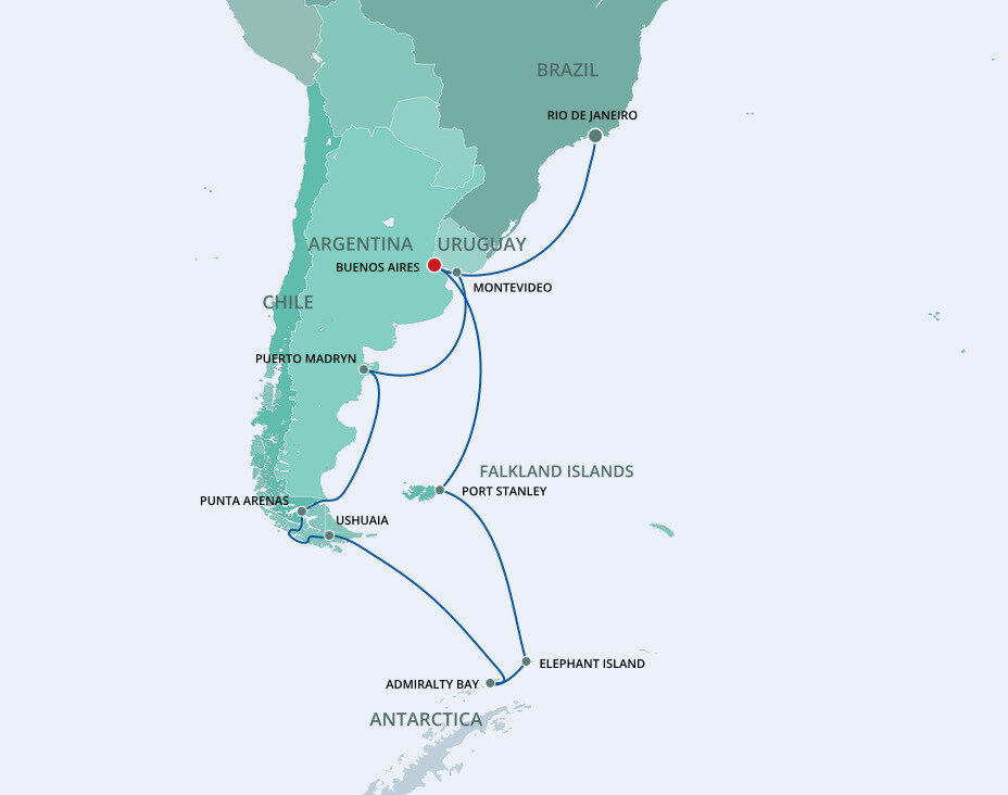 Located at the southernmost end of South America, Ushuaia is is often called a doorway to Antarctica. The town boasts incredible natural beauty through its national parks like the Tierra del Fuego National Park with cultural institutions like the Museo del Fin del Mundo, or the End of the World Museum. Ships will dock at this port.