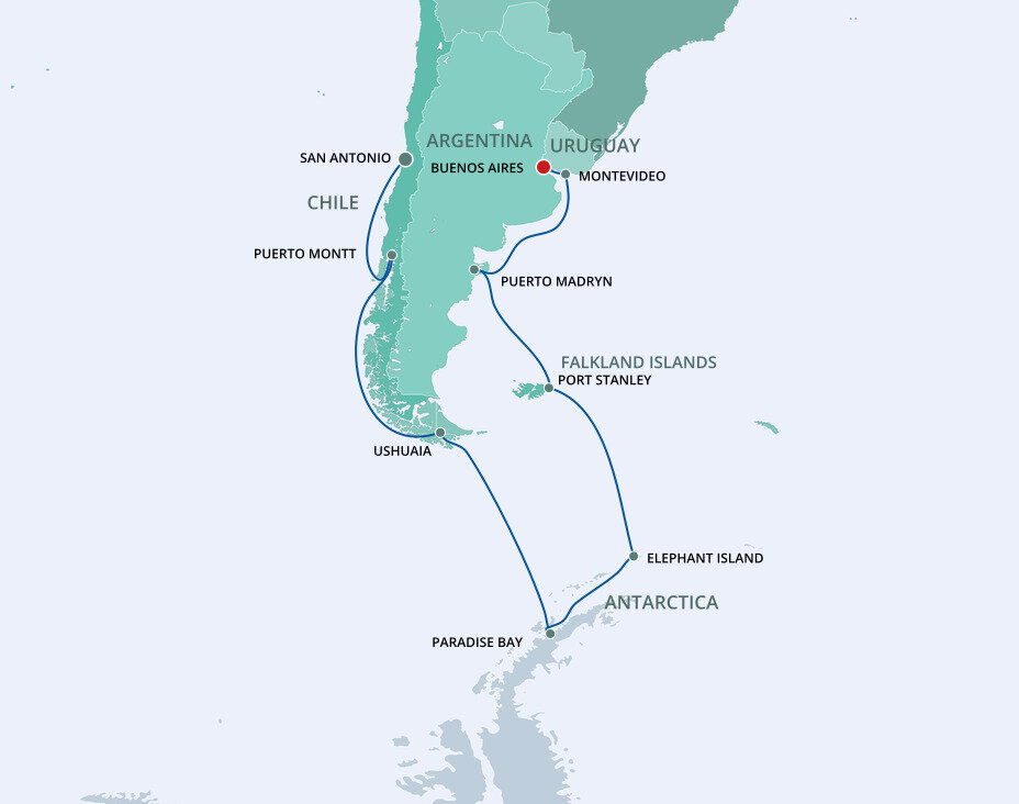 Located at the southernmost end of South America, Ushuaia is is often called a doorway to Antarctica. The town boasts incredible natural beauty through its national parks like the Tierra del Fuego National Park with cultural institutions like the Museo del Fin del Mundo, or the End of the World Museum. Ships will dock at this port.