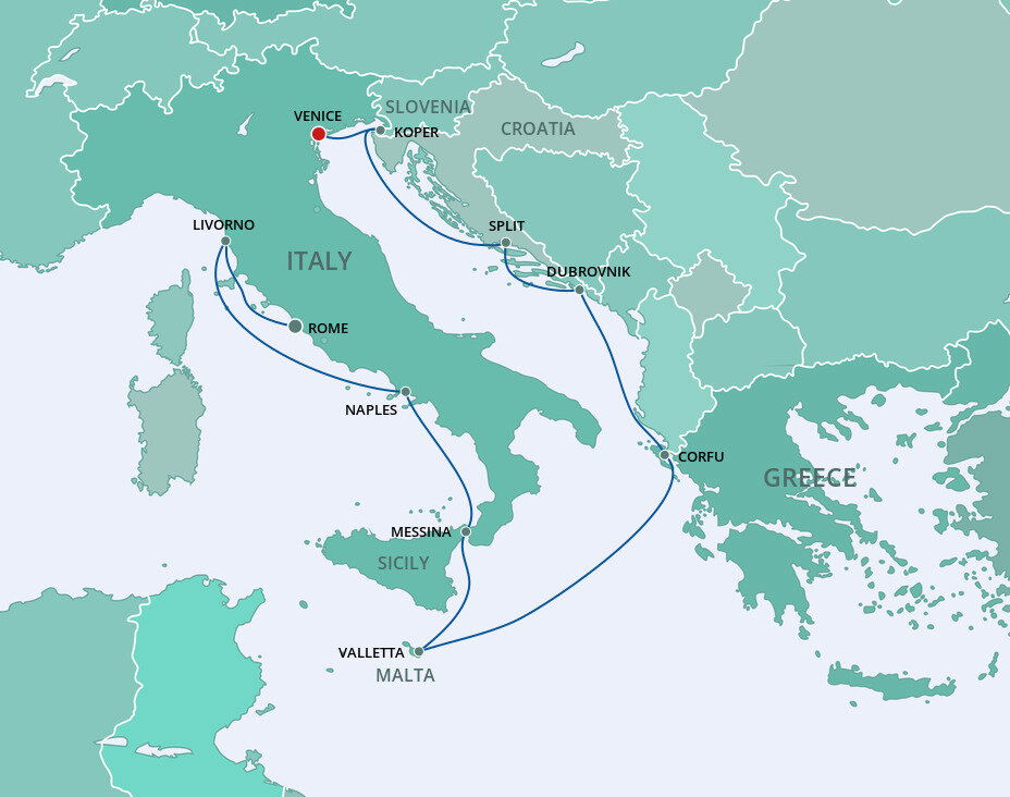 Venice is approximately 150 kilometers (93 miles) away, a journey that takes about 2 hours by train if you are making your own way there. Alternatively, your cruise documents will outline alternative transfer options if required.