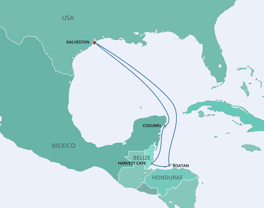 Featuring an enchanting range of environments such as tropical rainforests, marshes and coral reefs, Harvest Caye offers both relaxation and adventure amid lush landscapes. This pristine mangrove-covered 75-acre private island is a gem in the crown of Belize’s natural resources. Ships will dock at this port.