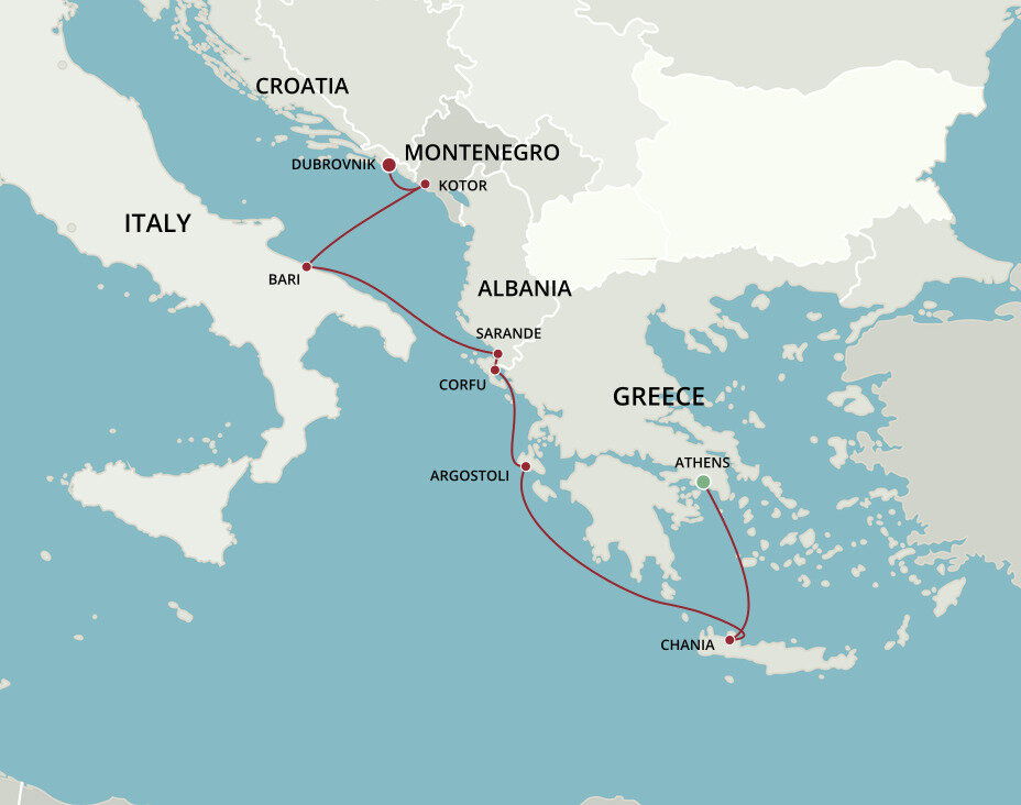 The lush and verdant island of Corfu lies in the Ionian Sea, midway between Greece and Italy. It is an island of sparkling beaches, mountains splashed with wildflowers, and historical, perched fortresses. Ships will dock at the town of Corfu.