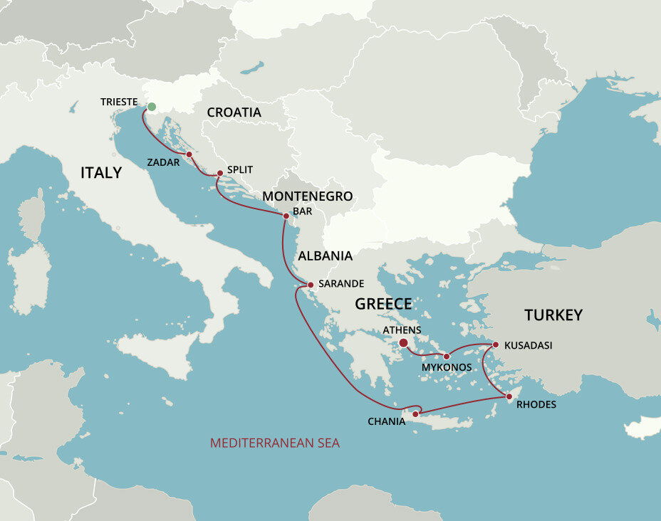 Overlooking the turquoise blue Ionian Sea, Albania’s most southerly harbour bathes in the glow of more than 300 sunny days each year. This seaside resort is celebrated for its lush natural habitat, dazzling displays of mosaics and artefacts, and historical sites such as the ruins of Onchesmos. Ships will anchor offshore and tender guests to the pier.