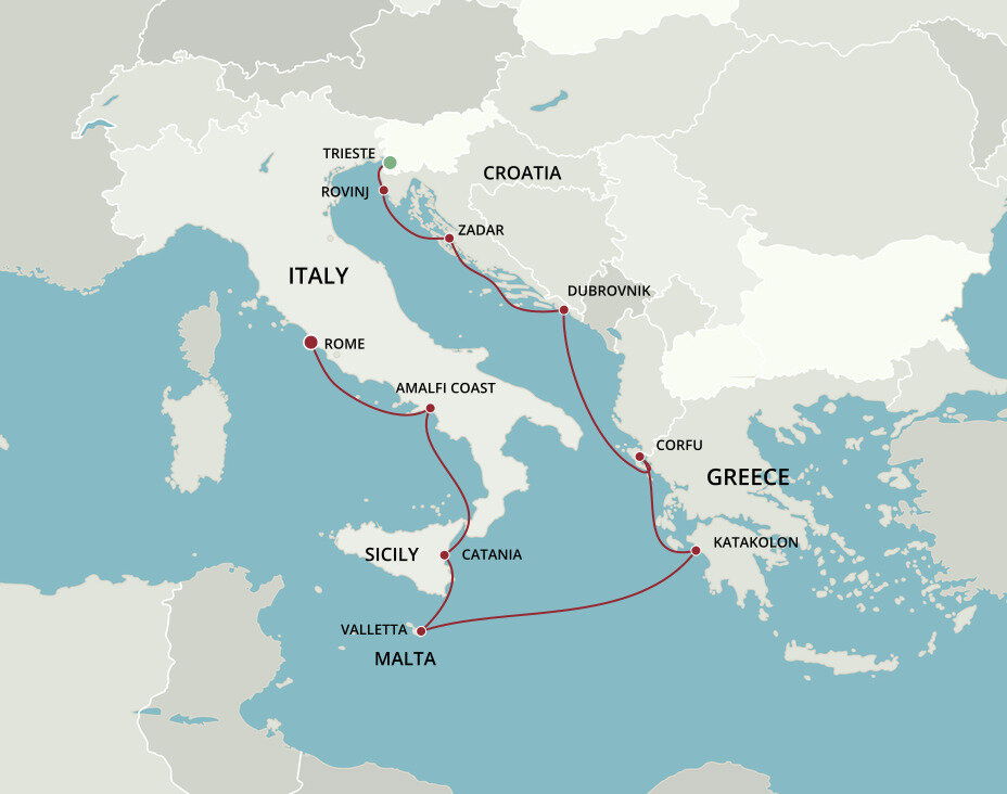 The lush and verdant island of Corfu lies in the Ionian Sea, midway between Greece and Italy. It is an island of sparkling beaches, mountains splashed with wildflowers, and historical, perched fortresses. Ships will dock at the town of Corfu.