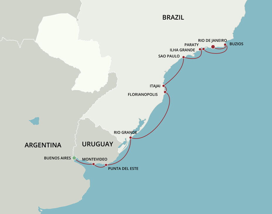 Upscale and desirable, Buzios is a beachy escape to a land of sun and thick palm-clad hills. With 17 luxurious, horseshoe-shaped beaches spreading out nearby, and a lively nightlife and culinary scene, Buzios is a place to kick back and soak up some of the best of Brazil's envied beach life. Ships will anchor offshore and tender guests to shore.