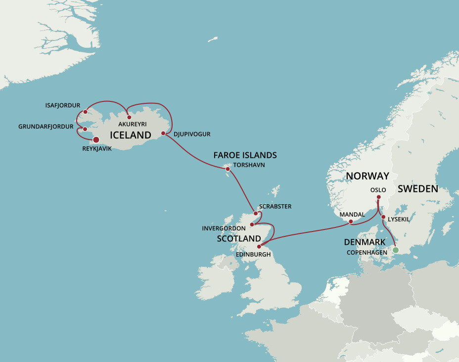 Grundarfjordur is a picturesque town situated on the fjord of Beidafjordur on the Snaefellsnes Peninsula. This charming fishing village is located right next to Kirkjufell mountain, the most photographed mountain in Iceland. Ships will dock at the Port of Grundarfjordur.