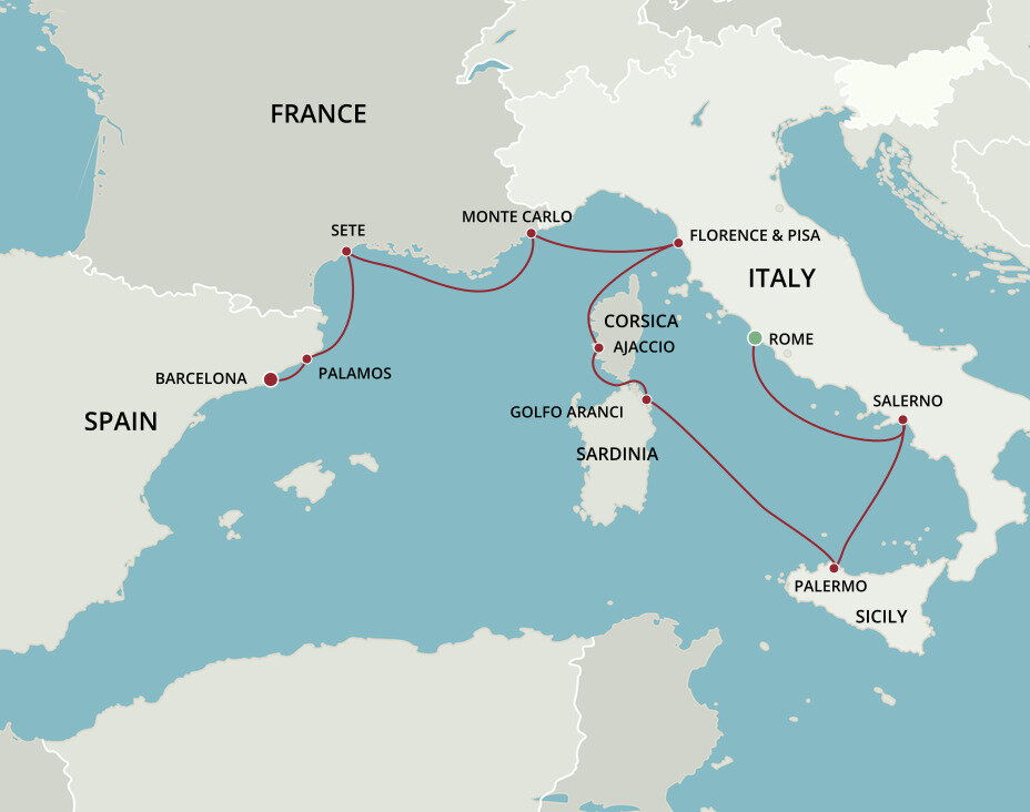 Located on the west coast of Corsica, Ajaccio is surrounded by green-hued mountains, with shady palm fringed squares and pleasure boats bobbing in the bay. The city is best known as the birthplace of Napoleon Bonaparte and his legacy dominates the city in its statues and street names. Ships will dock at Gare Maritime d’Ajaccio.