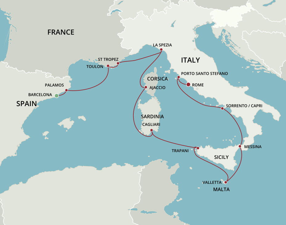 Cagliari, the capital of the island of Sardinia, is situated high upon hills that offer a panoramic view of the Golfo degli Angeli, the Gulf of Angels. Combining Byzantine churches with crumbling Roman ruins and Pisan towers, it’s an elegant, beguiling place to explore. Ships will dock at the Cagliari cruise port in Porto Cervo.