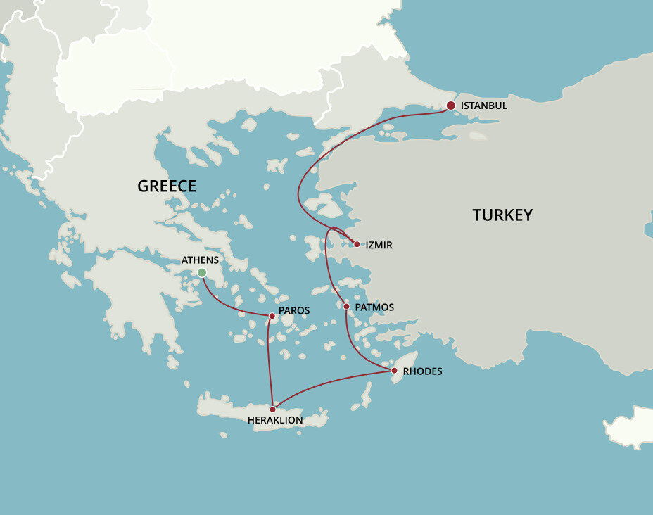 Patmos Island boasts idyllic beaches, swimming coves and historic hilltop mansions. Though many are drawn to Patmos for its natural beauty and seclusion, the island is also famous for being the location where St. John penned the Book of Revelations. Small ships will dock in the port town of Skala, while large ships will anchor offshore and tender guests to Skala.