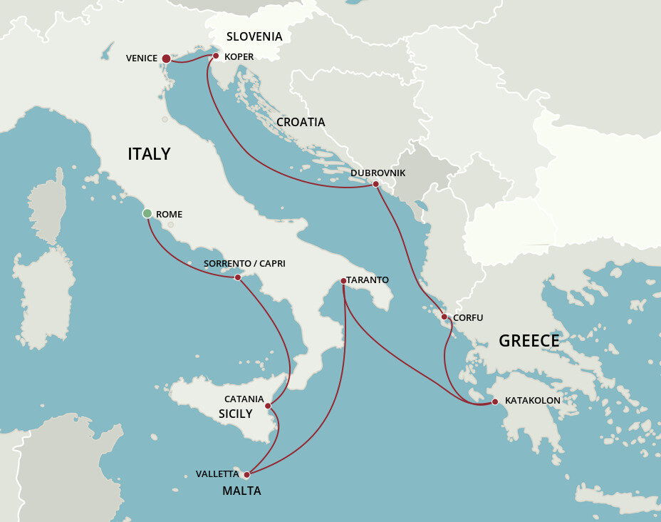 The lush and verdant island of Corfu lies in the Ionian Sea, midway between Greece and Italy. It is an island of sparkling beaches, mountains splashed with wildflowers, and historical, perched fortresses. Ships will dock at the town of Corfu.