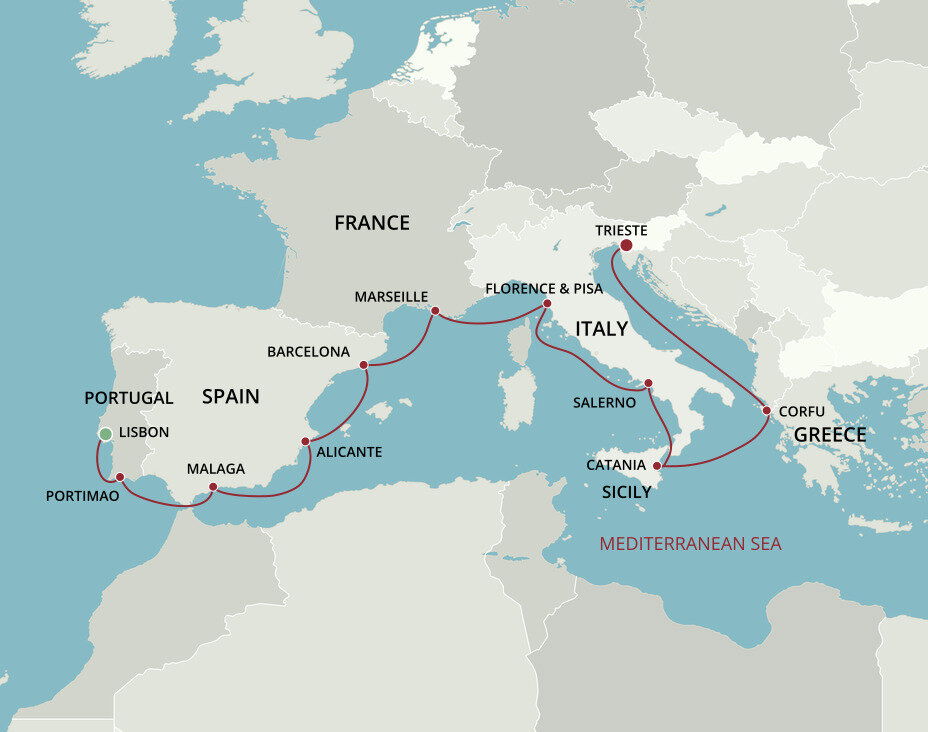The lush and verdant island of Corfu lies in the Ionian Sea, midway between Greece and Italy. It is an island of sparkling beaches, mountains splashed with wildflowers, and historical, perched fortresses. Ships will dock at the town of Corfu.