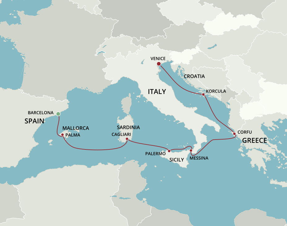 The lush and verdant island of Corfu lies in the Ionian Sea, midway between Greece and Italy. It is an island of sparkling beaches, mountains splashed with wildflowers, and historical, perched fortresses. Ships will dock at the town of Corfu.