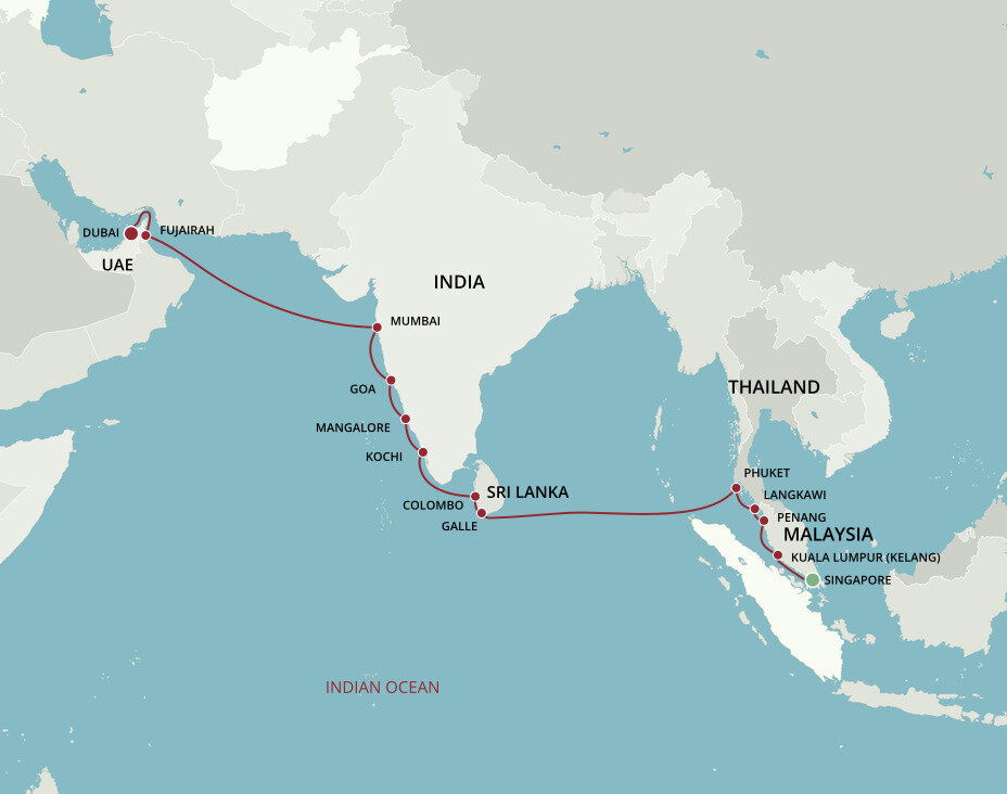 One of the seven emirates that make up the United Arab Emirates, Fujairah is the only emirate on the Gulf of Oman rather than the Persian Gulf. It boasts beautiful, unspoiled beaches and is best known for the ruggedly majestic Hajar mountain range which separates it from the rest of the country. Ships will dock at the Port of Fujairah.