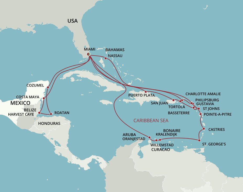 This multicultural city where the sun rules supreme is more than just a cruise port. Visitors from all over the world enjoy Miami’s famous Art Deco buildings, family-friendly zoos and romantic palm tree-lined streets filled with fantastic restaurants. Don’t forget about the white sandy beaches and year-round warm weather, perfect for relaxing before or after your Caribbean cruise from Miami.