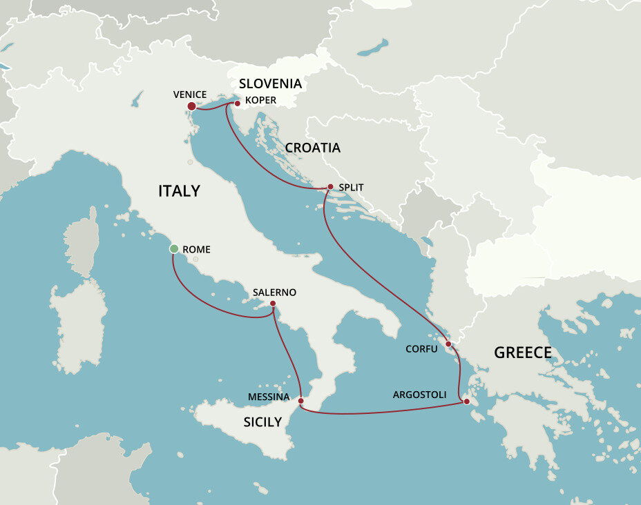 The lush and verdant island of Corfu lies in the Ionian Sea, midway between Greece and Italy. It is an island of sparkling beaches, mountains splashed with wildflowers, and historical, perched fortresses. Ships will dock at the town of Corfu.