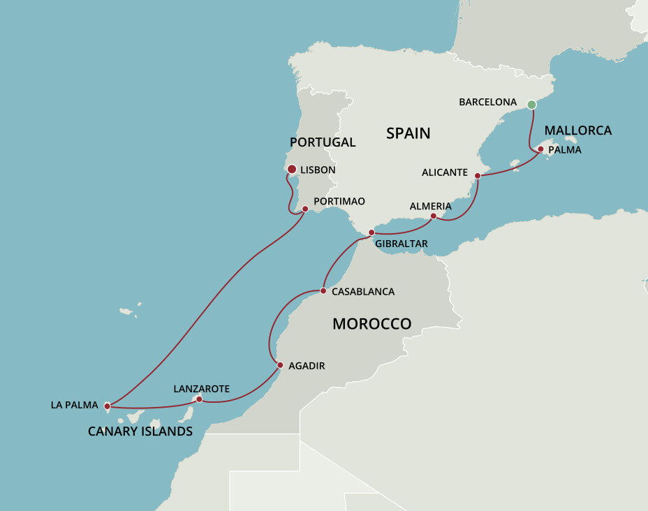 ‘La Isla Bonita,’ La Palma is one of the smaller of the Canary Islands. Its capital, Santa Cruz de la Palma, is a beautiful colonial-style city set on a picturesque harbour. The island’s landscape is one of black sand beaches, mountainous terrain and rich plant life. Ships will dock at the port of Santa Cruz de la Palma.