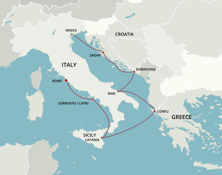 The lush and verdant island of Corfu lies in the Ionian Sea, midway between Greece and Italy. It is an island of sparkling beaches, mountains splashed with wildflowers, and historical, perched fortresses. Ships will dock at the town of Corfu.