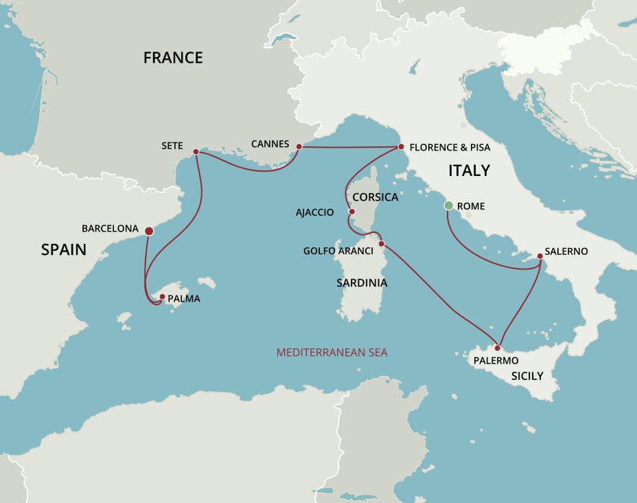 Located on the west coast of Corsica, Ajaccio is surrounded by green-hued mountains, with shady palm fringed squares and pleasure boats bobbing in the bay. The city is best known as the birthplace of Napoleon Bonaparte and his legacy dominates the city in its statues and street names. Ships will dock at Gare Maritime d’Ajaccio.