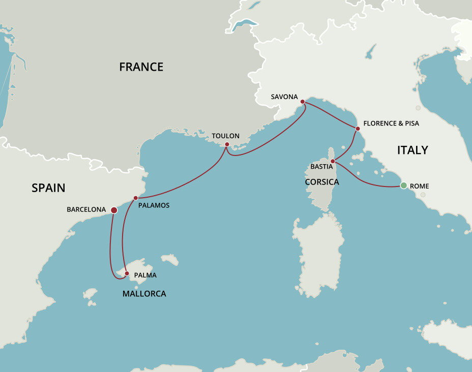 Your cruise finishes today in Barcelona, a captivating city on Spain's northeastern coast. If you're extending your stay in the city, start with a visit to La Sagrada Família, Antoni Gaudí's masterpiece, then wander through the narrow, historic streets of the Gothic Quarter.