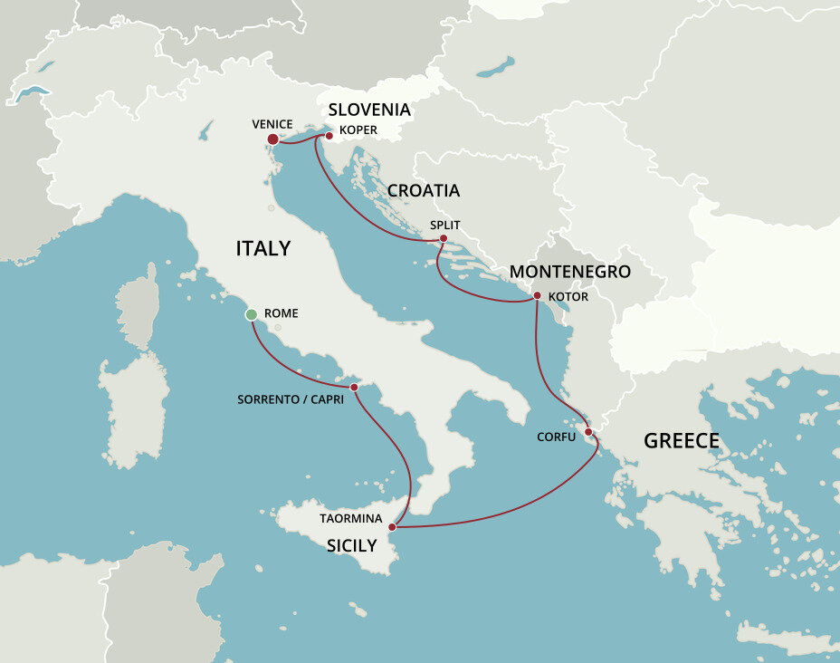 The lush and verdant island of Corfu lies in the Ionian Sea, midway between Greece and Italy. It is an island of sparkling beaches, mountains splashed with wildflowers, and historical, perched fortresses. Ships will dock at the town of Corfu.