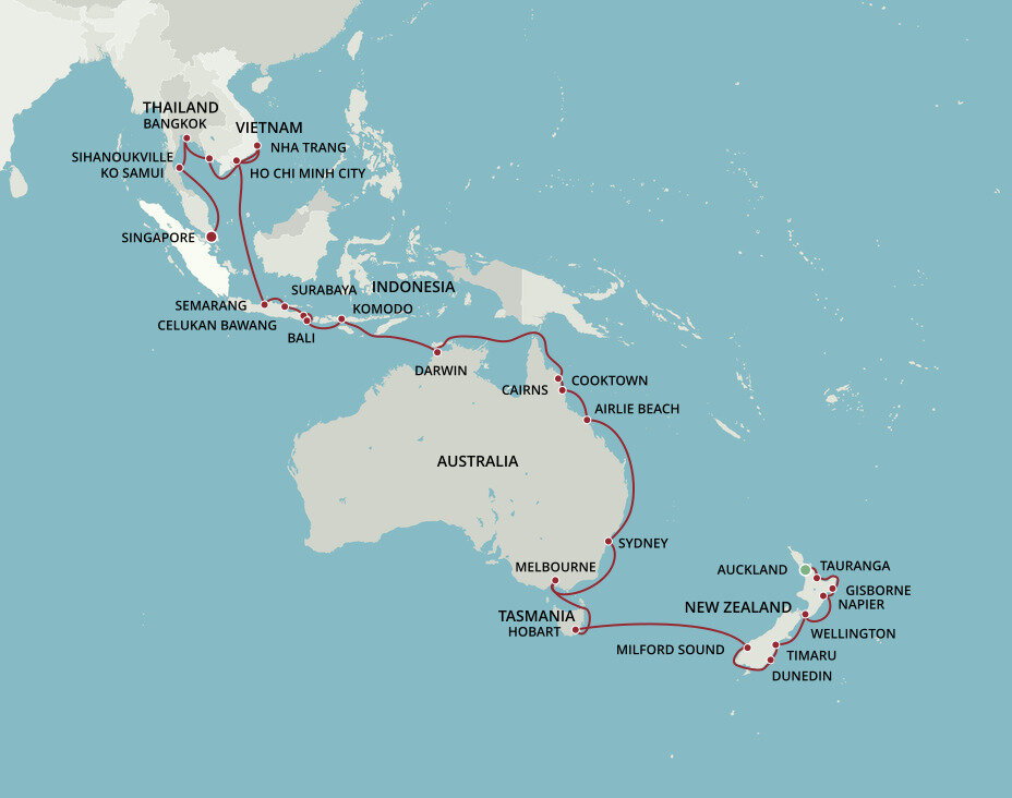 In downtown Auckland you can enjoy world-class dining, shopping, and sights. If you've a mind to explore, visit the island volcano of Rangitoto, or head to Waiheke, known as 'the island of wine' each are within a 40 minute ferry ride of your port.