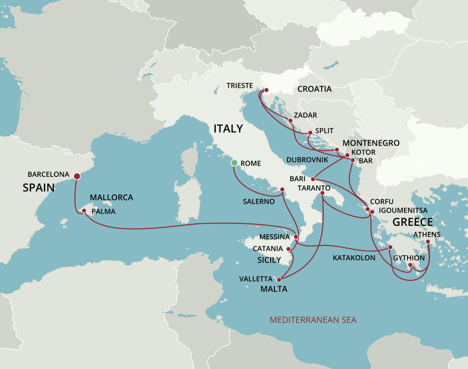 The lush and verdant island of Corfu lies in the Ionian Sea, midway between Greece and Italy. It is an island of sparkling beaches, mountains splashed with wildflowers, and historical, perched fortresses. Ships will dock at the town of Corfu.