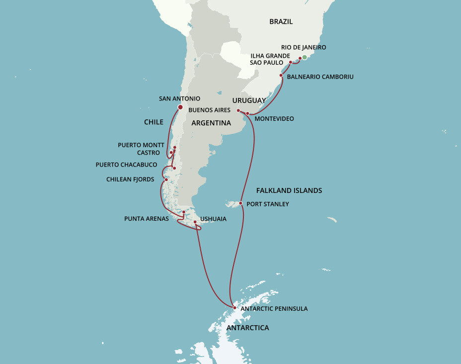 Located at the southernmost end of South America, Ushuaia is is often called a doorway to Antarctica. The town boasts incredible natural beauty through its national parks like the Tierra del Fuego National Park with cultural institutions like the Museo del Fin del Mundo, or the End of the World Museum. Ships will dock at this port.