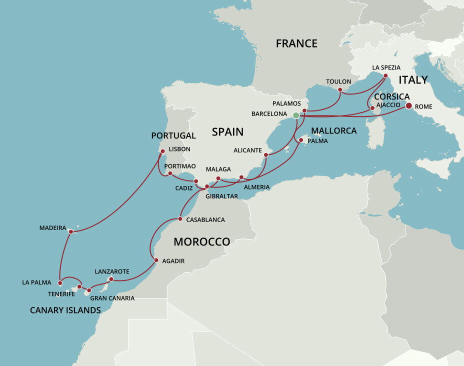Málaga is the lively capital of the Costa del Sol, famed for its beaches and mild climate. It is a city of narrow streets, whitewashed houses, churches and sunny plazas. Málaga also serves as a popular starting point for excursions to splendid Granada and the famed Alhambra. Ships will dock at the Málaga cruise terminal.