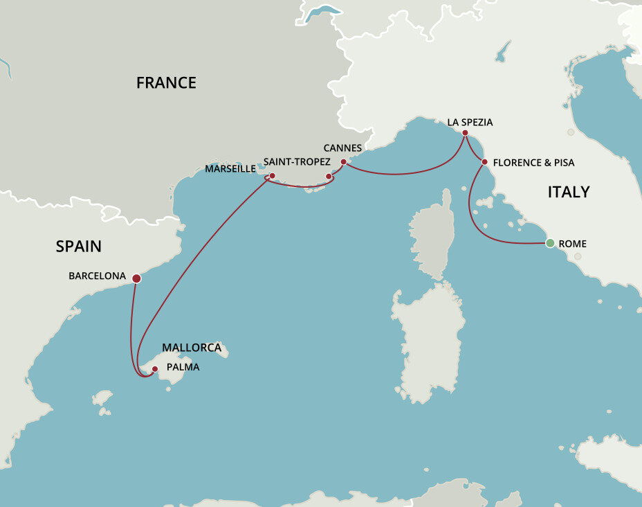 The quintessential Côte d'Azur resort town, Cannes has long been a playground for the rich and famous. Its epicentre is La Croisette, a boutique-lined boulevard with a legendary seven-mile beach. Ships will anchor offshore and tenders will be provided to the shore.