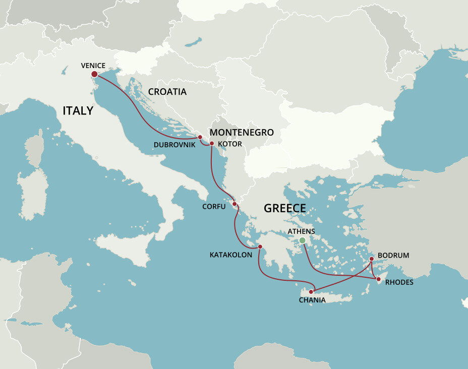 The lush and verdant island of Corfu lies in the Ionian Sea, midway between Greece and Italy. It is an island of sparkling beaches, mountains splashed with wildflowers, and historical, perched fortresses. Ships will dock at the town of Corfu.