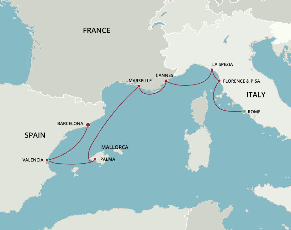 The quintessential Côte d'Azur resort town, Cannes has long been a playground for the rich and famous. Its epicentre is La Croisette, a boutique-lined boulevard with a legendary seven-mile beach. Ships will anchor offshore and tenders will be provided to the shore.