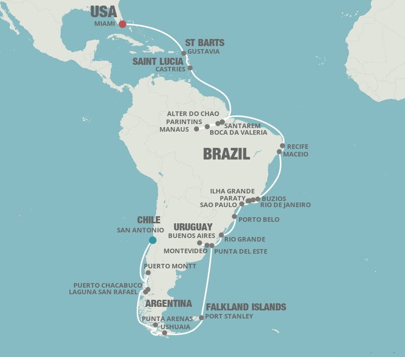 Located at the southernmost end of South America, Ushuaia is is often called a doorway to Antarctica. The town boasts incredible natural beauty through its national parks like the Tierra del Fuego National Park with cultural institutions like the Museo del Fin del Mundo, or the End of the World Museum. Ships will dock at this port.