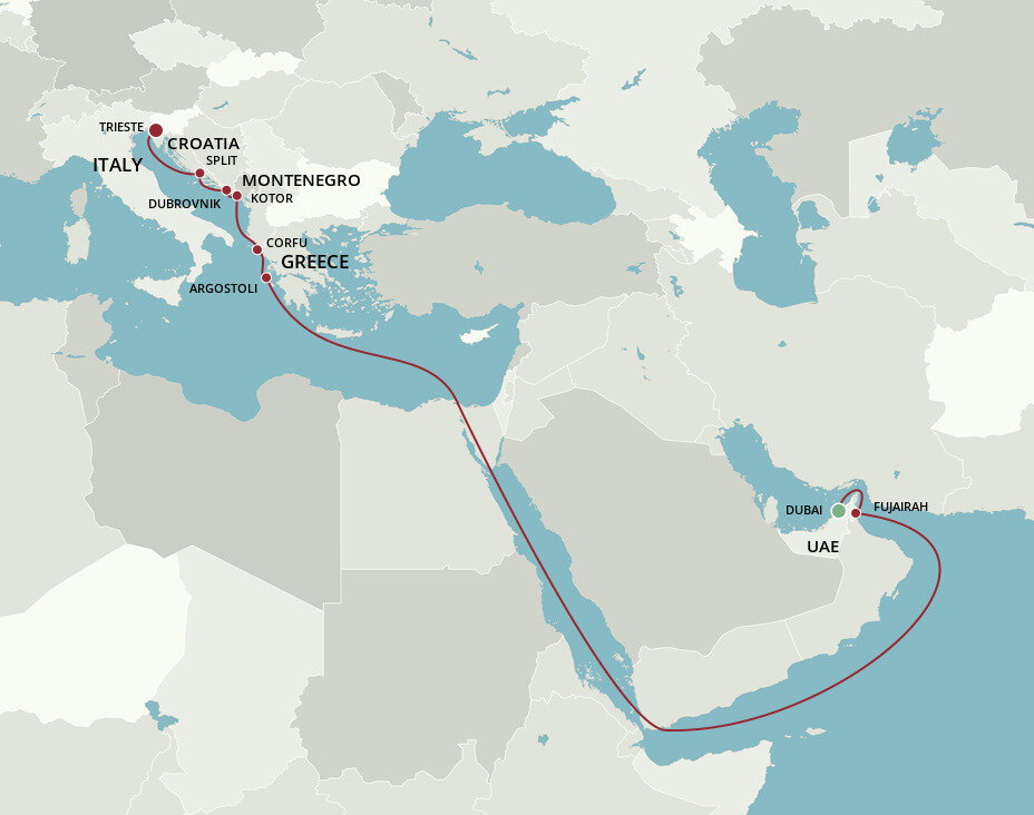 One of the seven emirates that make up the United Arab Emirates, Fujairah is the only emirate on the Gulf of Oman rather than the Persian Gulf. It boasts beautiful, unspoiled beaches and is best known for the ruggedly majestic Hajar mountain range which separates it from the rest of the country. Ships will dock at the Port of Fujairah.