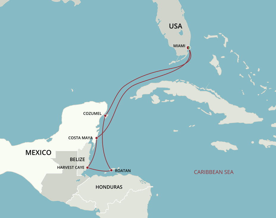 Featuring an enchanting range of environments such as tropical rainforests, marshes and coral reefs, Harvest Caye offers both relaxation and adventure amid lush landscapes. This pristine mangrove-covered 75-acre private island is a gem in the crown of Belize’s natural resources. Ships will dock at this port.