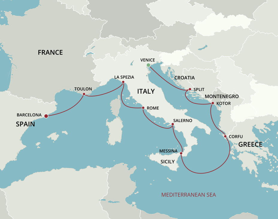 The lush and verdant island of Corfu lies in the Ionian Sea, midway between Greece and Italy. It is an island of sparkling beaches, mountains splashed with wildflowers, and historical, perched fortresses. Ships will dock at the town of Corfu.