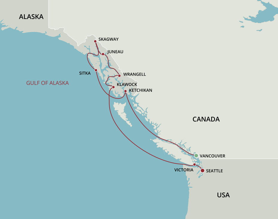 Alaska's Inside Passage offers breathtaking views of glaciers, fjords, and abundant wildlife , making it one of the most scenic cruises in the world and one of the few locations where deep-draft ships can sail close to steep mountain walls. Stretching from Puget Sound in Washington to the Alaskan Panhandle, this coastal route provides stunning natural scenery. Expect to see orcas, humpback whales, and sea lions from the deck, while eagles soar overhead.