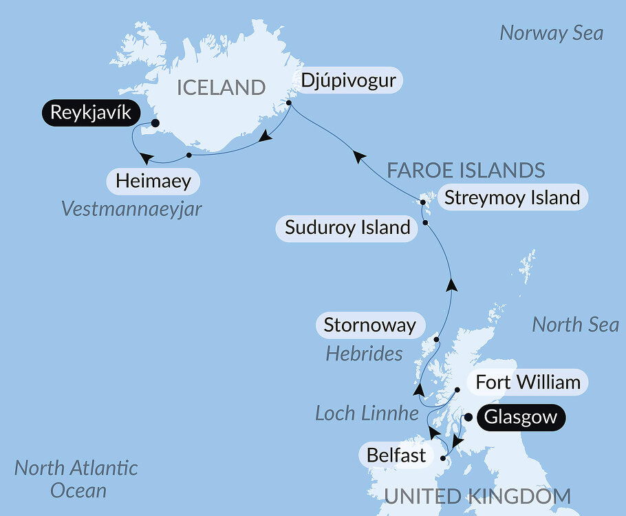 Located in the chilly and wild North Atlantic, it is common to see whales and seals in the surrounding waters. Puffins are also a common sight in summer, as the islands are considered as the largest Atlantic puffin colony in the world. Ships will dock in the main harbour.