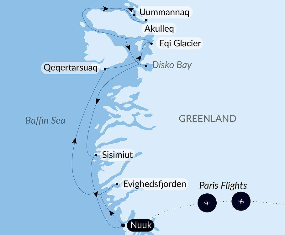 To the east of Baffin Bay, discover Disko Bay, scattered with countless icebergs produced by the Ilulissat Icefjord, a UNESCO World Heritage Site. From your ship, admire the majestic ballet of these ice giants as they slowly drift across the dark waters. This site is a natural marvel of Greenland, and is also renowned as an observation point for the region’s many humpback whales. The encounters with wild fauna and stunning landscapes in the heart of this spectacular and fragile nature will be pure moments of wonder for you.