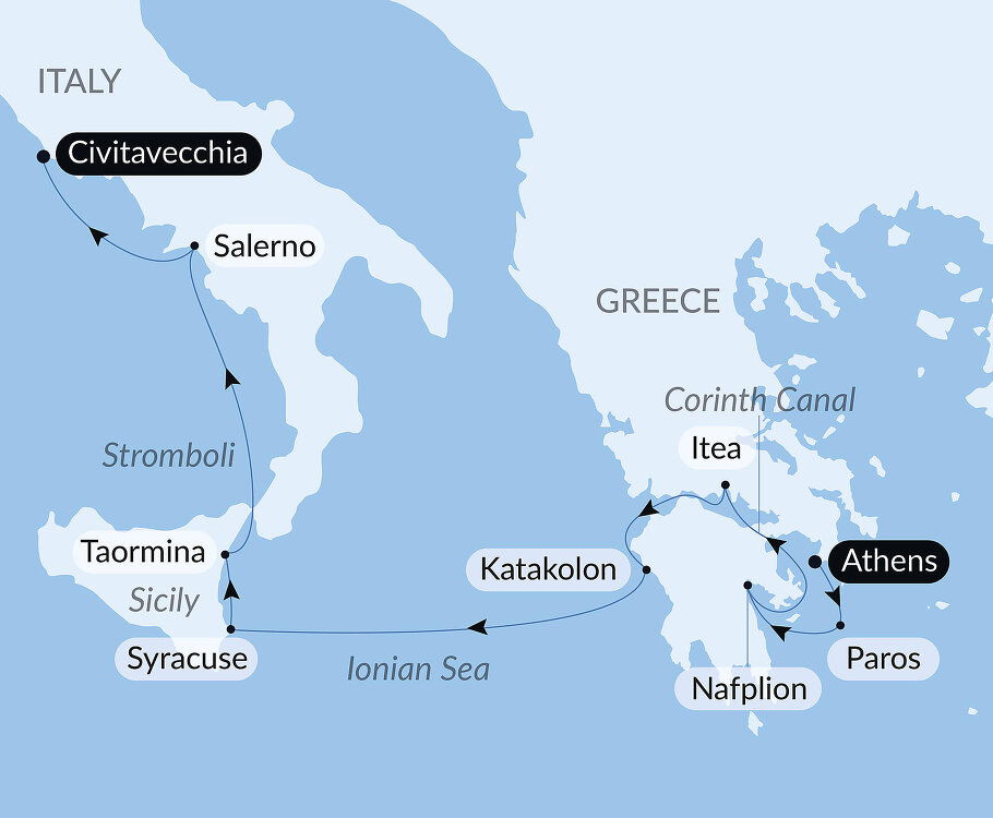 You'll dock at the port of Itea, which is 17 kilometers (11 miles) from Delphi, with a travel time of about 30 minutes. Itea itself is a charming coastal town with its serene waterfront and inviting cafes, offering a pleasant start before heading to the ancient ruins of Delphi.