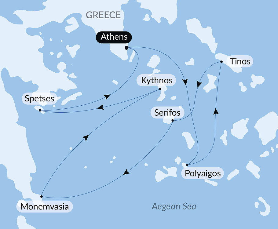 You will discover Kythnos, an arid and rocky island covered in maquis. Low dry stone walls delimit the terraces where olive groves stand alongside fig and almond trees that feed the imagination as much as the people. Discover the chora and its beautiful white houses by taking a stroll along the intertwined streets. Then, the welcoming shade of a parasol awaits you for a nap on the beach. You might also be tempted by a swim or a spot of paddle-boarding or kayaking to discover the exceptional landscapes of this island surrounded by the exceptionally beautiful Aegean Sea.