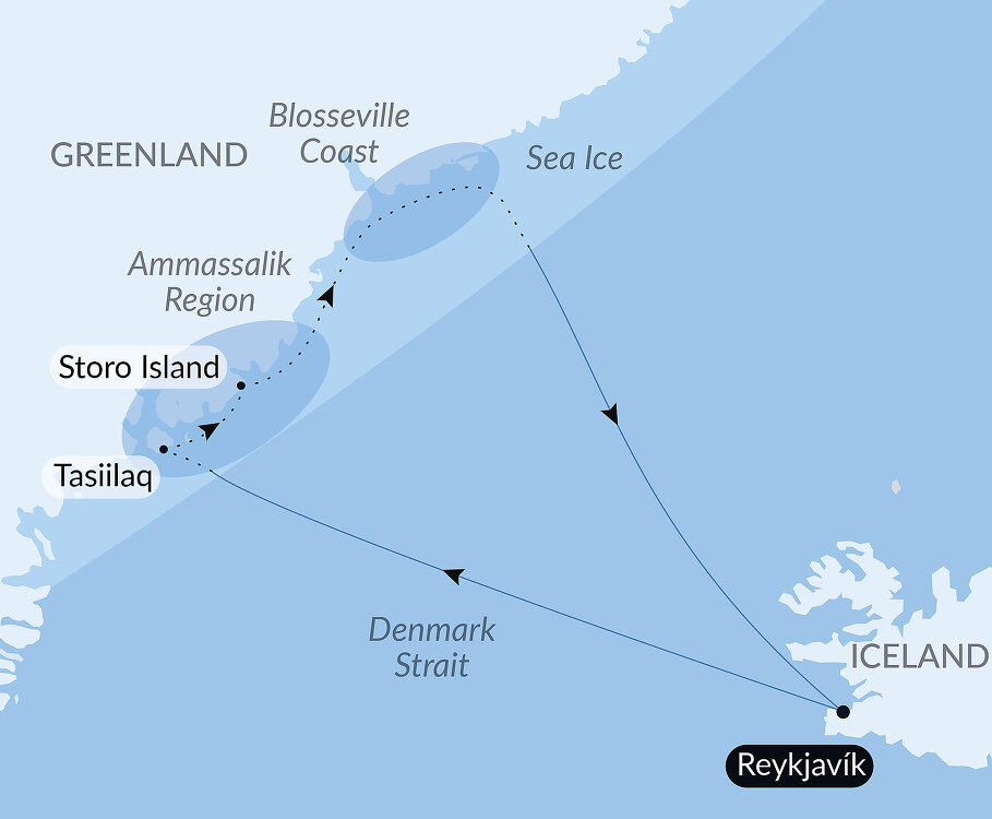 Still almost unknown just a century ago, the east coast of Greenland remains the most authentic and majestic region. Here, the alpine mountains merge intimately with the sea, while the fjords are adorned with high snow-capped peaks and drifting icebergs.