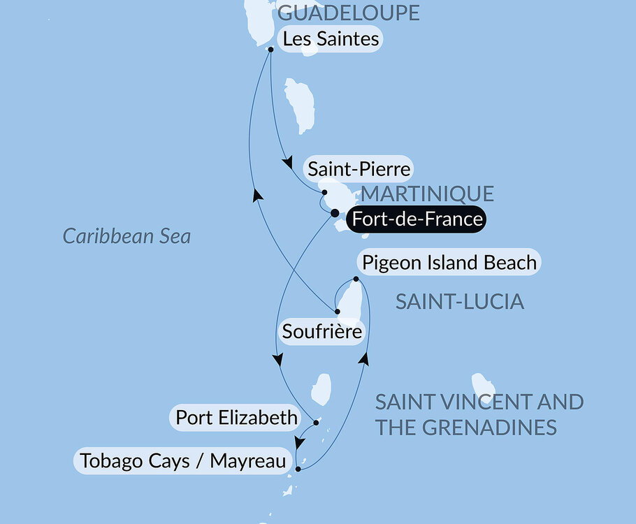 Iles Des Saintes or Les Saintes is formed by nine unspoiled islands, two of which are inhabited. Forest-coated island cones rise from the turquoise waters and crystalline tropical beaches line the shores of these heavenly Caribbean islands. Ships will anchor offshore and tenders will be provided to the island, Terre de Haut.